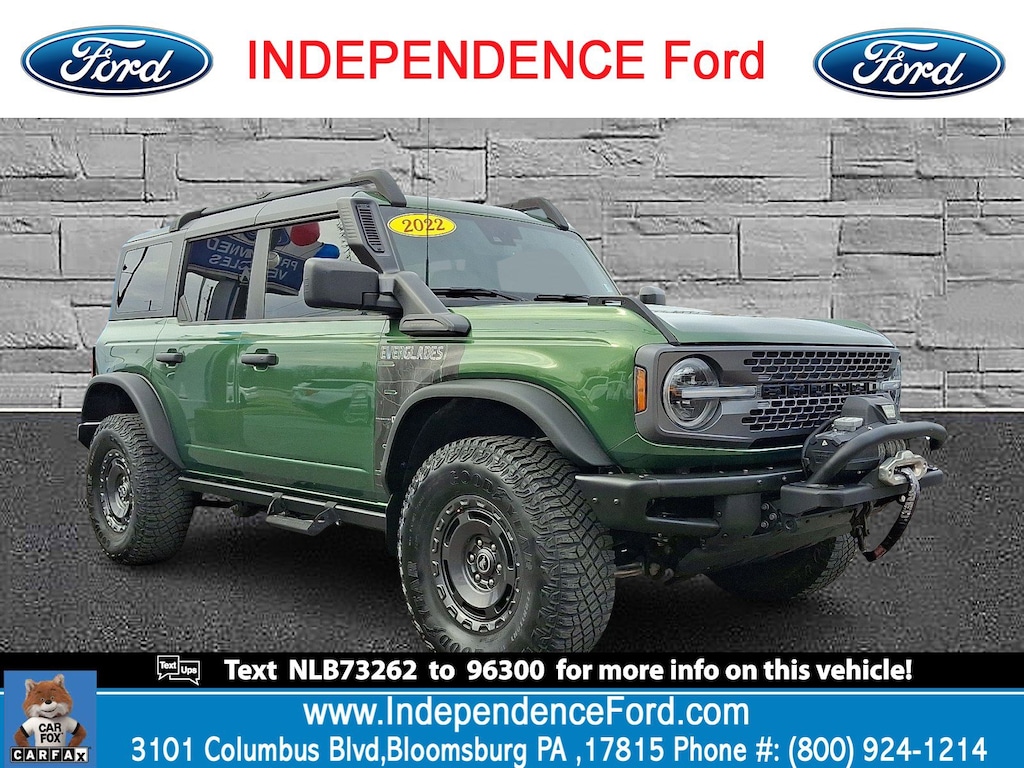 Check out this 2022 Ford Bronco Everglades. Its Automatic transmission and Intercooled Turbo Regular Unleaded I-4 2.3 L/140 engine will keep you going. This Ford Bronco features the following options: ENGINE: 2.3L ECOBOOST I-4 (STD), Wireless Phone Connectivity, Wheels: 17" Carbonized Gray-Painted Aluminum, Voice Activated Dual Zone Front Automatic Air Conditioning, Vinyl/Rubber Floor Trim, Upfitter Switches, Transmission: 10-Speed Automatic -inc: trail control and trail turn assist, Transmission w/Driver Selectable Mode, Sequential Shift Control and Oil Cooler, Tracker System, and Towing Equipment -inc: Trailer Sway Control. Stop by and visit us at Independence Ford, 3101 Columbia Boulevard Route 11, Bloomsburg, PA 17815.