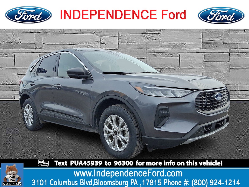 Look at this 2023 Ford Escape Active. Its Automatic transmission and Intercooled Turbo Premium Unleaded I-3 1.5 L/91 engine will keep you going. This Ford Escape features the following options: TRANSMISSION: 8-SPEED AUTOMATIC (STD), FRONT LICENSE PLATE BRACKET -inc: Standard in states requiring two license plates and optional to all others, EQUIPMENT GROUP 200A, ENGINE: 1.5L ECOBOOST -inc: auto start-stop technology (STD), Wireless Phone Connectivity, Wheels: 17" Shadow Silver-Painted Aluminum, Valet Function, Unique Cloth Front Bucket Seats -inc: 8-way power driver (fore/aft, up/down, recline, lumbar) and 4-way manual front passenger (fore/aft w/manual recline), Trunk/Hatch Auto-Latch, and Transmission: 8-Speed Automatic. See it for yourself at Independence Ford, 3101 Columbia Boulevard Route 11, Bloomsburg, PA 17815.