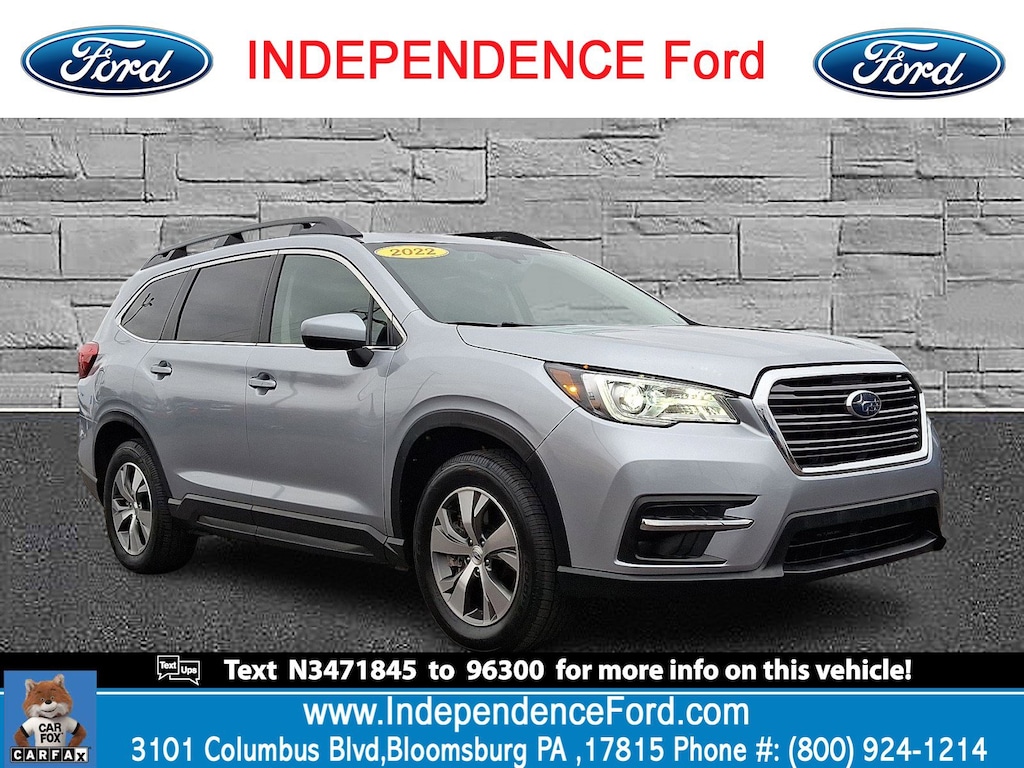 Come see this 2022 Subaru Ascent Premium. Its Variable transmission and Intercooled Turbo Regular Unleaded H-4 2.4 L/146 engine will keep you going. This Subaru Ascent has the following options: SLATE BLACK, SPILL RESISTANT COATED CLOTH UPHOLSTERY -inc: silver or ivory stitching, ICE SILVER METALLIC, CARGO TRAY -inc: Part number J501SXC100, ALL-WEATHER FLOOR LINERS -inc: Part number J501SXC030, Not intended for use on top of or in conjunction w/any other floor mat, Wireless Phone Connectivity, Window Grid Antenna, Wheels: 18" x 7.5 J Gray Alloy w/Machine Finish, Voice Activated Dual Zone Front Automatic Air Conditioning, Variable Intermittent Wipers w/Heated Wiper Park, and Valet Function. See it for yourself at Independence Ford, 3101 Columbia Boulevard Route 11, Bloomsburg, PA 17815.