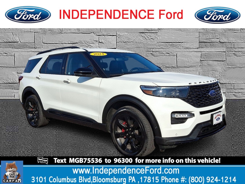 Come see this 2021 Ford Explorer ST. Its Automatic transmission and Twin Turbo Premium Unleaded V-6 3.0 L/183 engine will keep you going. This Ford Explorer has the following options: Class III Towing Equipment -inc: Hitch and Trailer Sway Control, ENGINE: 3.0L ECOBOOST V6 -inc: auto start-stop technology (STD), Wheels: 20" Machined Aluminum w/Painted Pockets, Voice Activated Dual Zone Front Automatic Air Conditioning, Trunk/Hatch Auto-Latch, Transmission: 10-Speed Automatic, Transmission w/Driver Selectable Mode, Trailer Wiring Harness, SYNC 3 Communications & Entertainment System -inc: enhanced voice recognition, 8" LCD capacitive touchscreen in center stack w/swipe capability, AppLink, 911 Assist, Apple Car Play and Android Auto compatibility and 1 smart-charging multimedia USB port in the media hub, and Streaming Audio. Test drive this vehicle at Independence Ford, 3101 Columbia Boulevard Route 11, Bloomsburg, PA 17815.