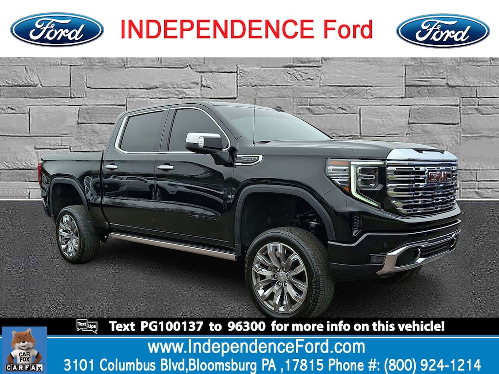 Look at this 2023 GMC Sierra 1500 Denali. Its Automatic transmission and Turbocharged Diesel I6 3.0L/ engine will keep you going. This GMC Sierra 1500 has the following options: TIRES, 275/50R22SL ALL-SEASON, BLACKWALL, SUNROOF, POWER, SEATS, FRONT BUCKET with center console (STD), REAR CAMERA MIRROR, INSIDE REARVIEW AUTO-DIMMING with full camera display, REAR AXLE, 3.23 RATIO, ONYX BLACK, MULTICOLOR 15" DIAGONAL HEAD-UP DISPLAY, LPO, WHEEL LOCKS, SET OF 4 (dealer-installed), GVWR, 7200 LBS. (3266 KG), and GMC MULTIPRO POWER STEPS, REARWARD ARTICULATING (providing bed access). Foot activated running side board.. Stop by and visit us at Independence Ford, 3101 Columbia Boulevard Route 11, Bloomsburg, PA 17815.