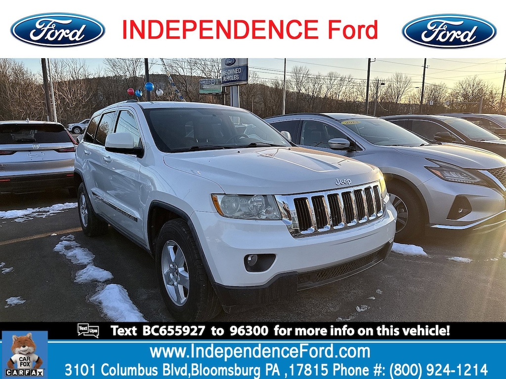Come see this 2011 Jeep Grand Cherokee Laredo. Its Automatic transmission and Gas/Ethanol V6 3.6L/220 engine will keep you going. This Jeep Grand Cherokee comes equipped with these options: STONE WHITE, P245/70R17 ON/OFF ROAD BSW TIRES (STD), DARK GRAYSTONE/MEDIUM GRAYSTONE INTERIOR, CLOTH LOW-BACK BUCKET SEATS, 5-SPEED AUTOMATIC TRANSMISSION (STD), 3.6L VVT V6 FLEX-FUEL ENGINE (STD), 26E LAREDO CUSTOMER PREFERRED ORDER SELECTION PKG -inc: 3.6L V6 engine, 5-speed auto trans, 17" ALUMINUM WHEELS (STD), Vehicle information center, Variable intermittent windshield wipers, and Trailer sway damping. See it for yourself at Independence Ford, 3101 Columbia Boulevard Route 11, Bloomsburg, PA 17815.